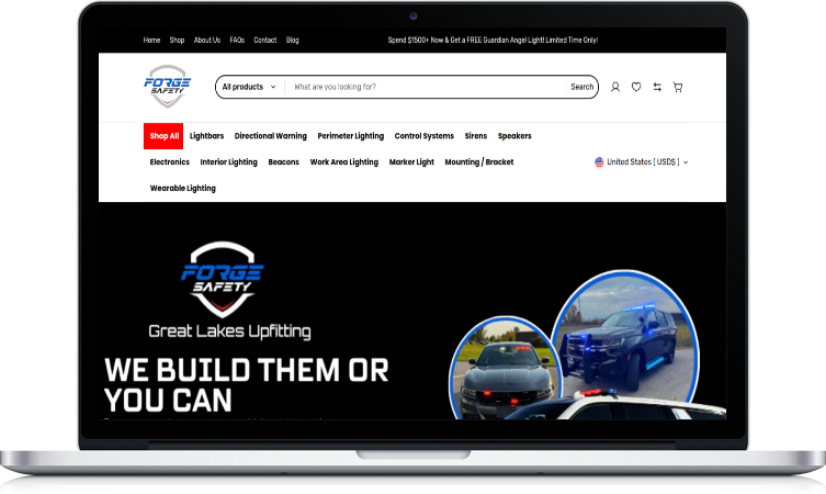 Forge Safety Vehicles is an e-commerce platform specializing in high-quality emergency vehicle equipment and safety lighting products. The site offers a wide range of products from reputable brands like SoundOff Signal, Opti-Luxx, TecNiq, and Guardian Angel.