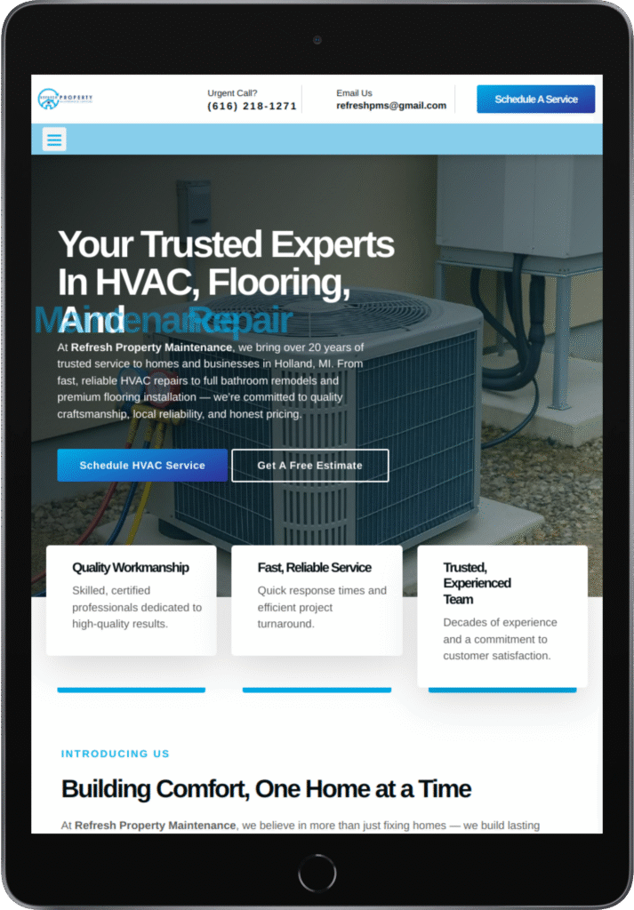 The goal was to create a professional, user-friendly website that highlights the company’s diverse services, from HVAC repairs to remodeling and flooring. The new site needed to present trust and reliability, simplify scheduling and quote requests, and showcase client testimonials. At the same time, it had to emphasize Refresh’s family-owned values, local roots, and long-standing commitment to quality service.